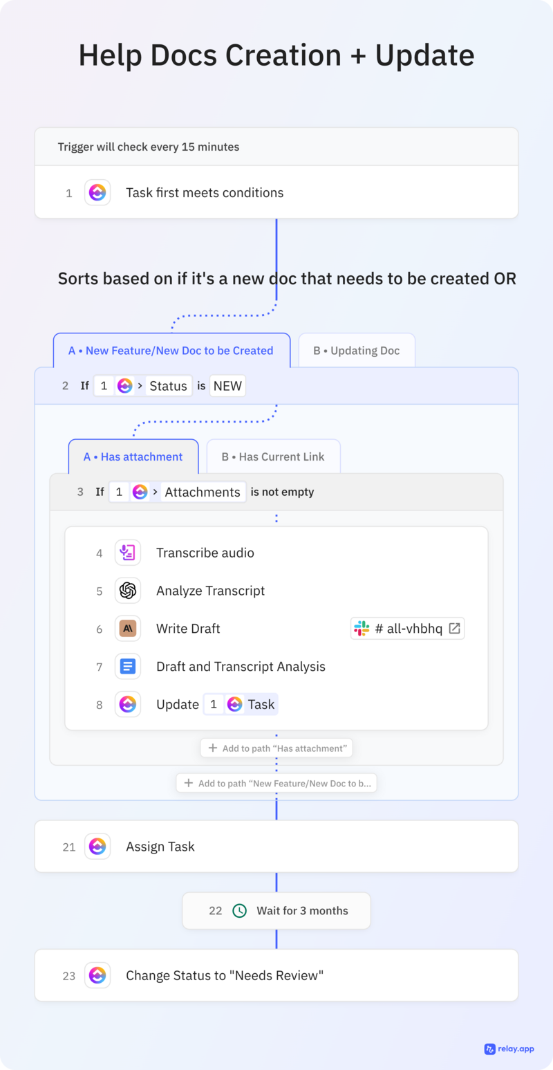 When your product or processes change, your AI agent can automatically update all related help documentation, ensuring your customers and team always have access to accurate information. No more outdated docs, no more confused customers, no more 'I forgot to update that' moments.